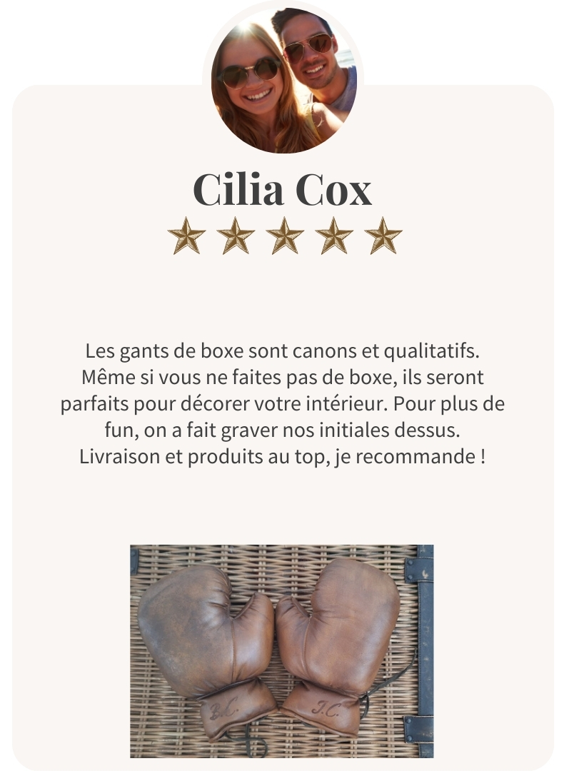 Nous pouvons personnaliser votre paire de gants de boxe vintage en gravant votre prénom ou le logo de votre club. Nous avons amélioré notre process de sorte que vous puissiez graver chaque gant. Par défaut nous gravons au niveau des poignets. Si vous préférez que la gravure soit située sur le dos de la main par exemple, vous pouvez nous le préciser dans l’encadré « note » lors de la commande.