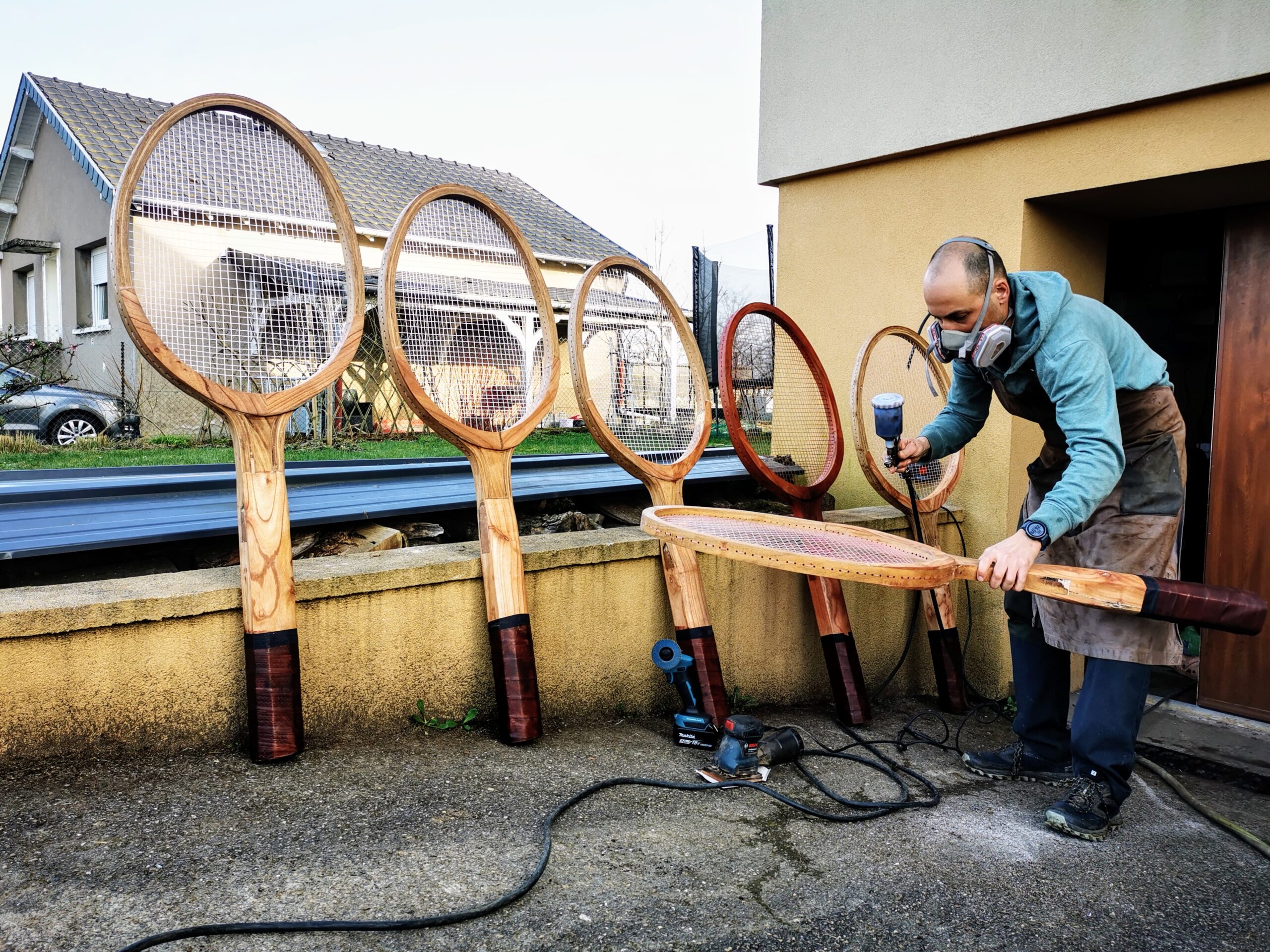Pour marquer les esprits en matière de tennis vintage, vous pouvez parfois trouver des raquettes en bois géantes. Mais chez Ben et Flo, on aime bien démocratiser l’accessibilité à la déco vintage alors nous sommes en plein développement d’un nouveau modèle de raquette de tennis : la taille XXL méga géante !