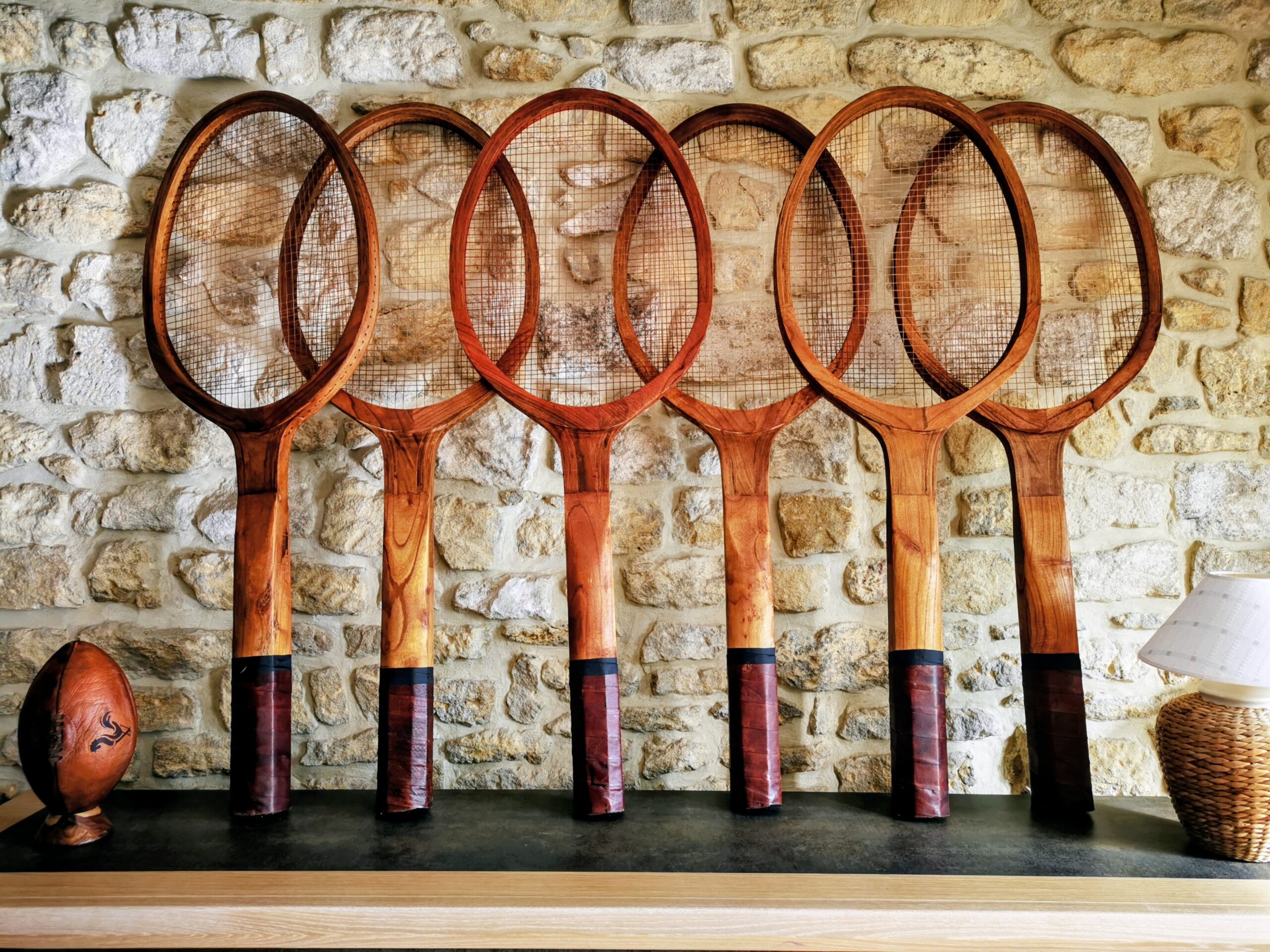La décoration tennis s’inspire directement de ces objets anciens, en jouant sur les matières, les formes et l’histoire des équipements sportifs.